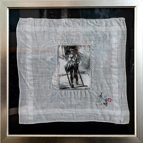 Joyce Ellen Weinstein ‘The Alpine Hiker’ Drypoint Etching on Handkerchief 15.5”x15.5” Framed $550